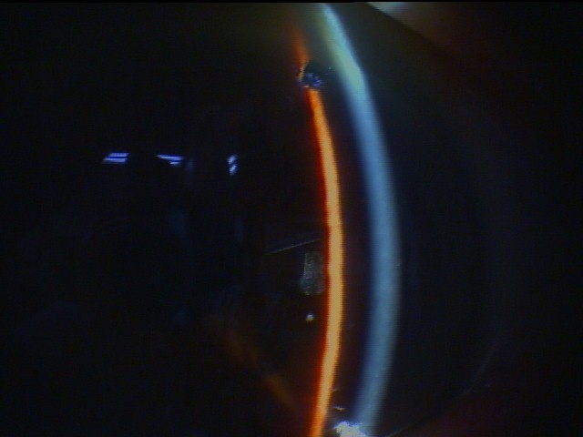 2)LIにより、広がった前房。 茶色の線の上部に見える穴がLI。